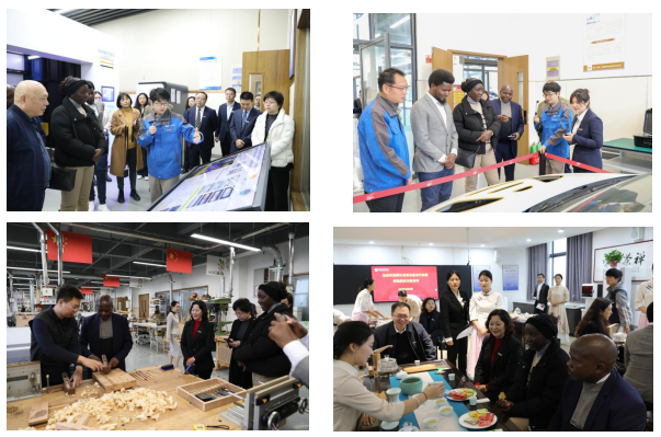 赞比亚职业教育使团一行还在夏新颜董事长和赵丽霞处长的陪同下,参观了学校的智能制造学院、汽车工程学院等实训中心。他们详细了解了学校的教学设施、实训条件和团队力量,对学校的教学质量和办学水平给予了高度评价。