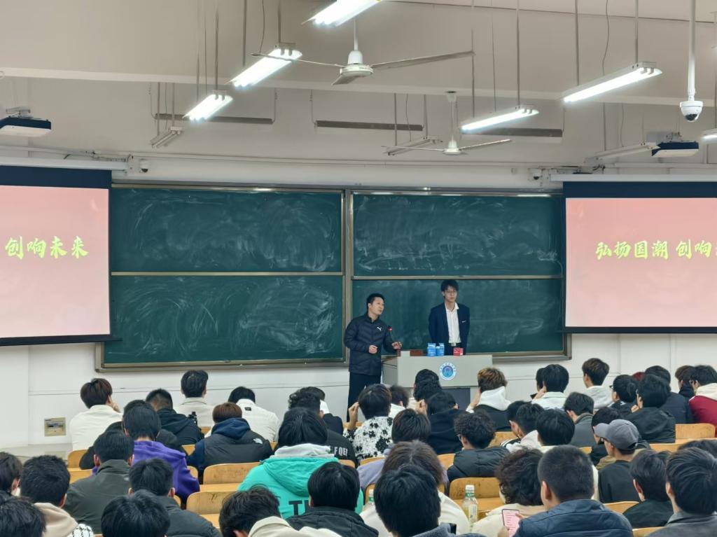 公司党总支书记王伟对任志远的到来表示热烈欢迎,并向在座的同学们简要介绍了任志远在校期间的优秀表现。随后,任志远以“弘扬国潮,创响未来”为主题,与同学们分享了自己的奋斗历程。