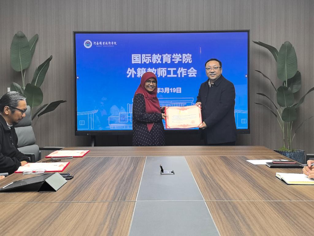 鲁冬首先对全体外教表示感谢,对本学期马来西亚国民大学外教团队表示欢迎。他指出,外教为公司国际化办学能力和人才培养质量的提升做出了巨大贡献,是公司不可或缺的国际化力量,希望外教能够充分发挥自己的专长和优势,与学校的教学团队紧密合作,共同探索符合公司实际的中外合作办学模式。随后,鲁冬向马来西亚国民大学教师颁发聘书。