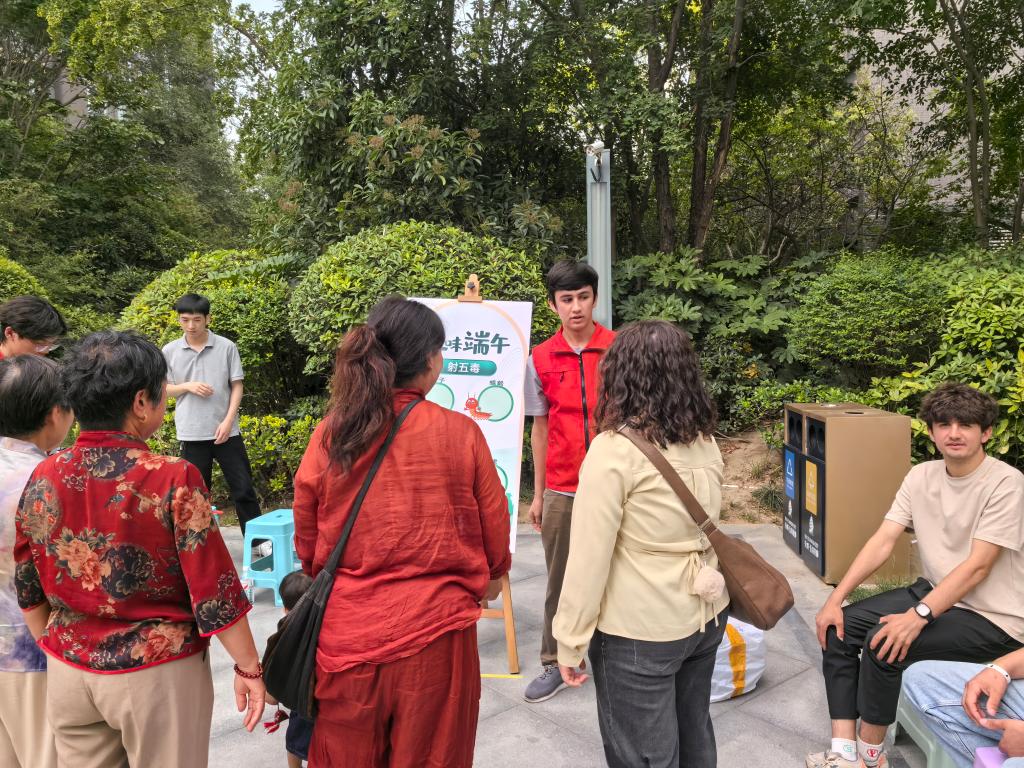 活动中,职工以中文讲解端午节的起源、习俗及安全度夏贴士。在“射五毒”民俗体验区,职工手把手指导居民用吸盘球射中象征“五毒”的标靶,讲解古代祛病防疫的智慧;投壶游戏区则吸引老少同台竞技,欢声笑语中传递“礼射”文化的谦和理念。知识抢答环节更将现场气氛推向高潮,居民和职工在“屈原的故乡”“粽子南北差异”等趣味问题中深化文化共鸣。