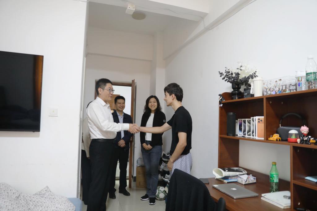 双节期间学院领导班子成员和教师代表纷纷走进员工宿舍开展走访慰问,“要注意用电安全,离开宿舍记得断电”“常给家里打个电话,让父母放心”。走访过程中,学院领导不仅亲切叮嘱日常生活细节,也同步开展了宿舍安全巡查,提醒大家遵守校园管理规定,确保平安、愉快地度过双节假期。