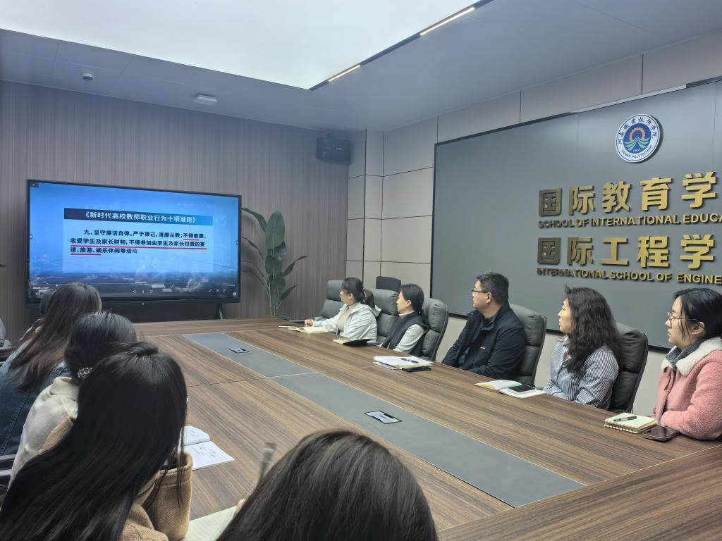 3月16日下午,全体教师首先集中学习了习近平总书记关于加强党的作风建设的重要论述以及师德师风建设相关政策法规。通过观看教育部《‘依法规范执教’师德警示教育》视频,会议重点解读了《新时代高校教师职业行为十项准则》,并传达了学校师德师风建设工作专题会议精神。会议引导全体教职工深刻认识到,师德师风是教师队伍建设的首要标准,廉洁自律是教育工作者的立身之本,切实增强贯彻落实的政治自觉、思想自觉和行动自觉。