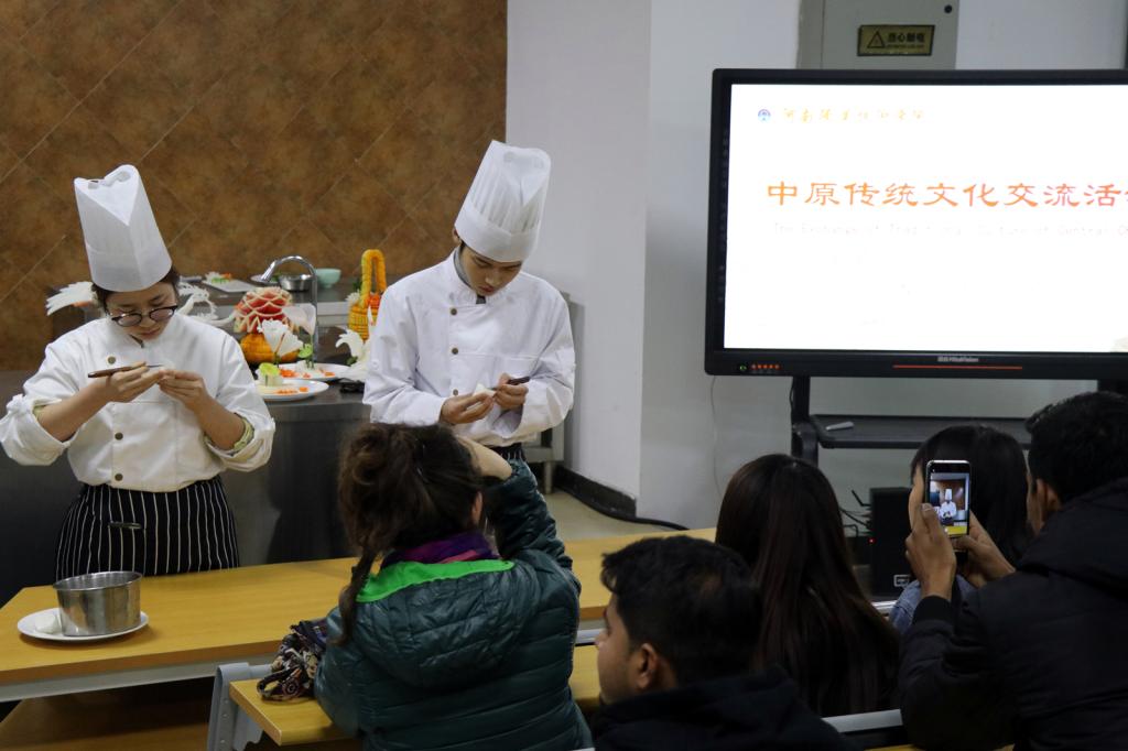 随后,学校分别在音乐厅和烹饪食品与健康学院实训基地,向到访的国际友人集中展示了极具中原文化特色的优势项目,包括传统乐器表演、舞蹈表演、武术表演等精彩的艺术节目,还有体现中原地区特色的雕刻、刀工、拉面等饮食文化技艺,这也成为本次交流活动的一大亮点。