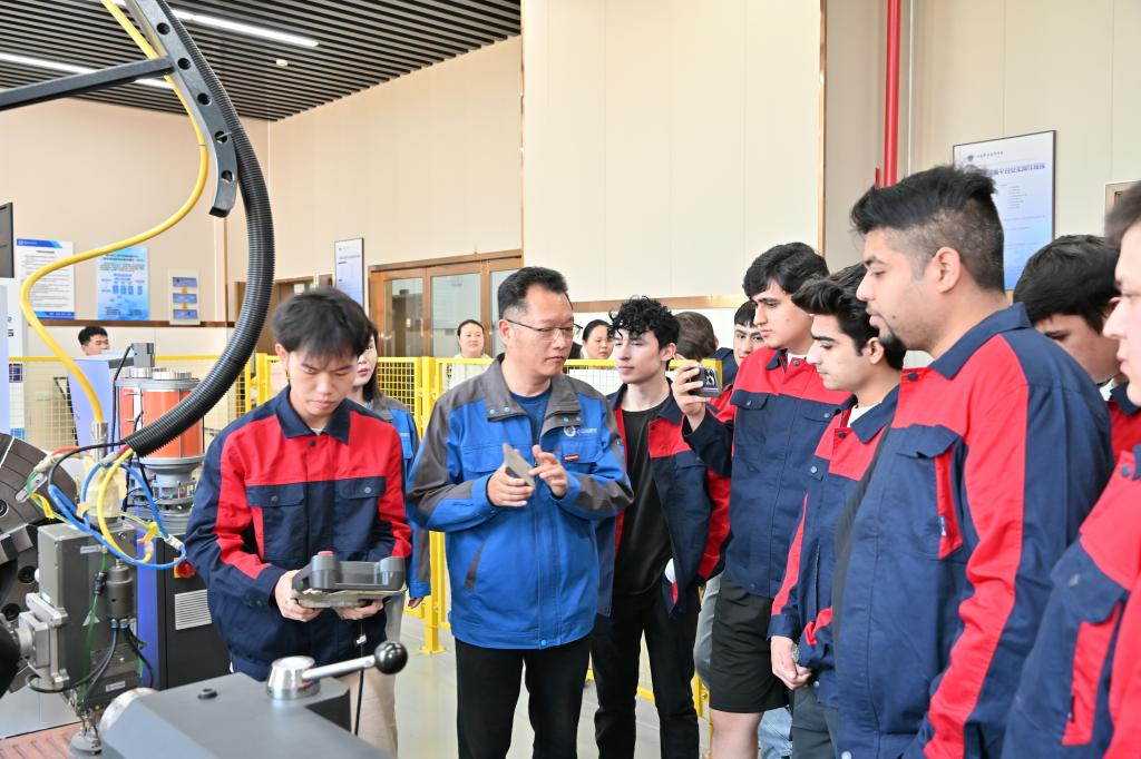 职工在先进的设备前驻足良久,认真聆听、积极交流,对学校先进的实训设备、浓厚的实践教学氛围和专业的教师团队赞不绝口。来自塔吉克斯坦的语言生舒林表示,实训室的设备非常先进,希望能有机会继续在学校学习相关专业和技术。