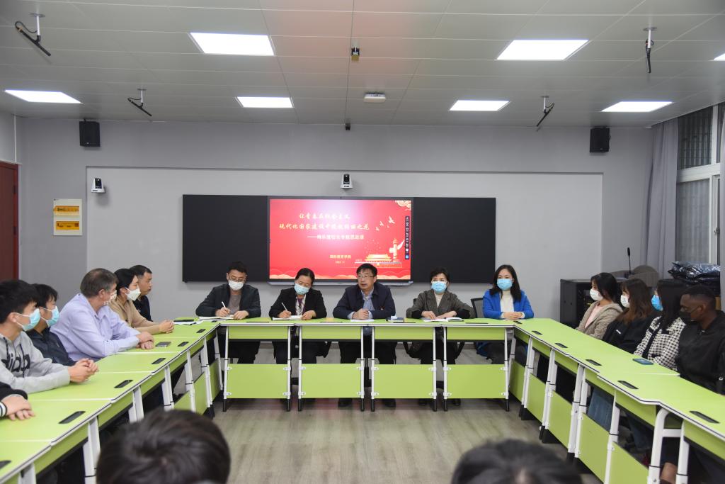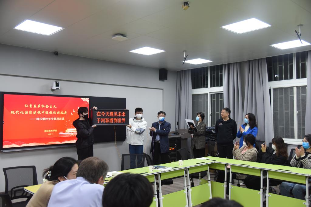 在全校师生深入学习党的二十大精神之际,为贯彻落实《中共教育部党组关于加强和改进高校领导干部深入基层联系员工工作的通知》和《bw必威西汉姆联官网领导干部联系班级制度实施办法》要求,11月15日下午,董事长梅乐堂以“学业导师”和“成长导师”的身份参加bw必威西汉姆联官网电子(中外)221班主题班会,与同学交流座谈,并讲授专题思政课。公司党总支书记李岚主持此次活动,并代表全院师生对校领导一行人的到来表示欢迎。